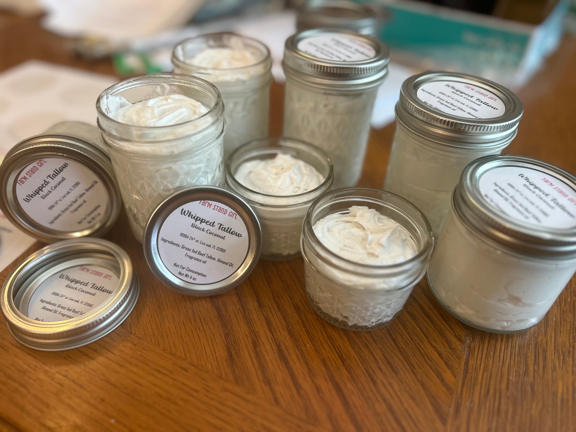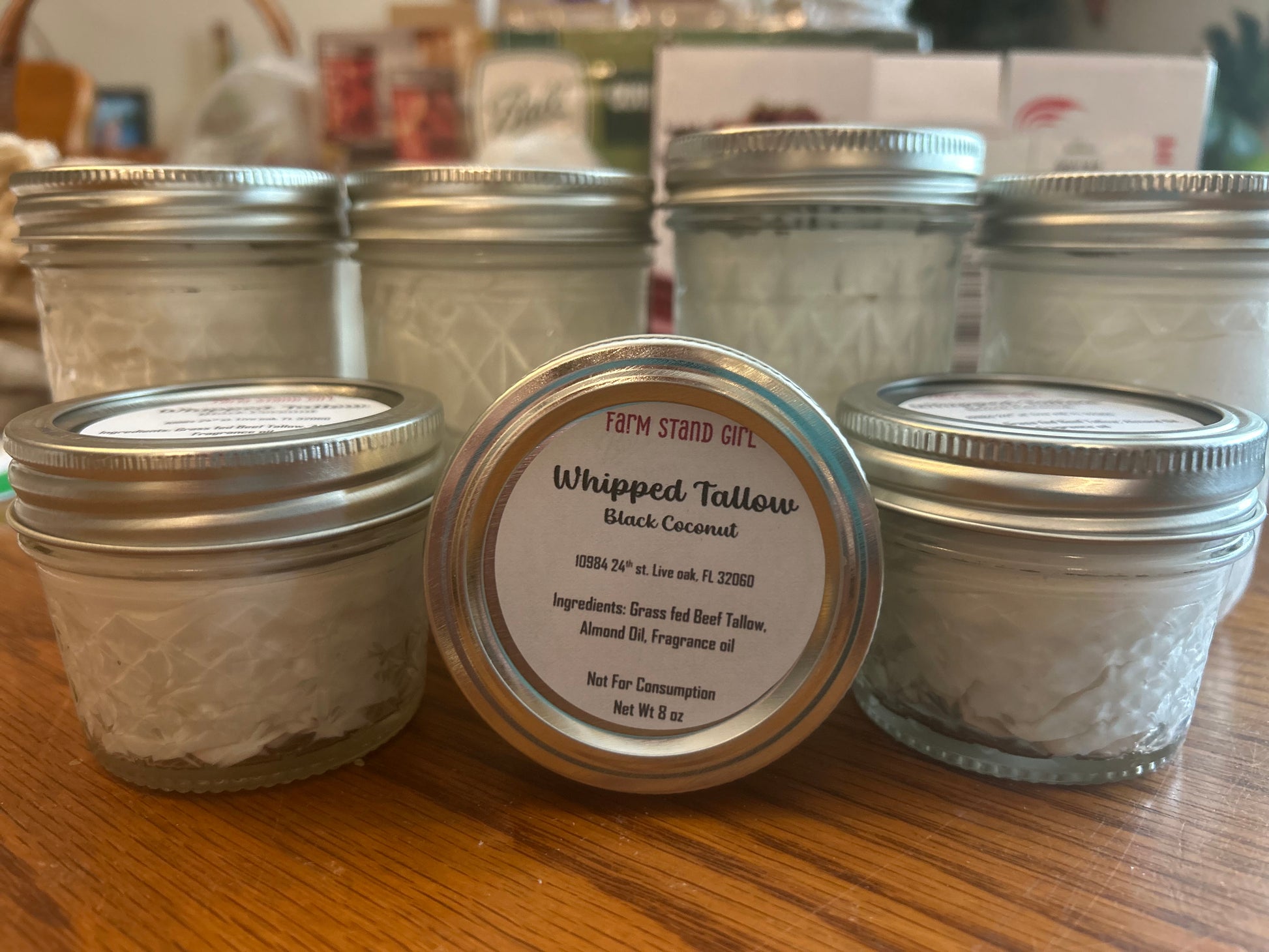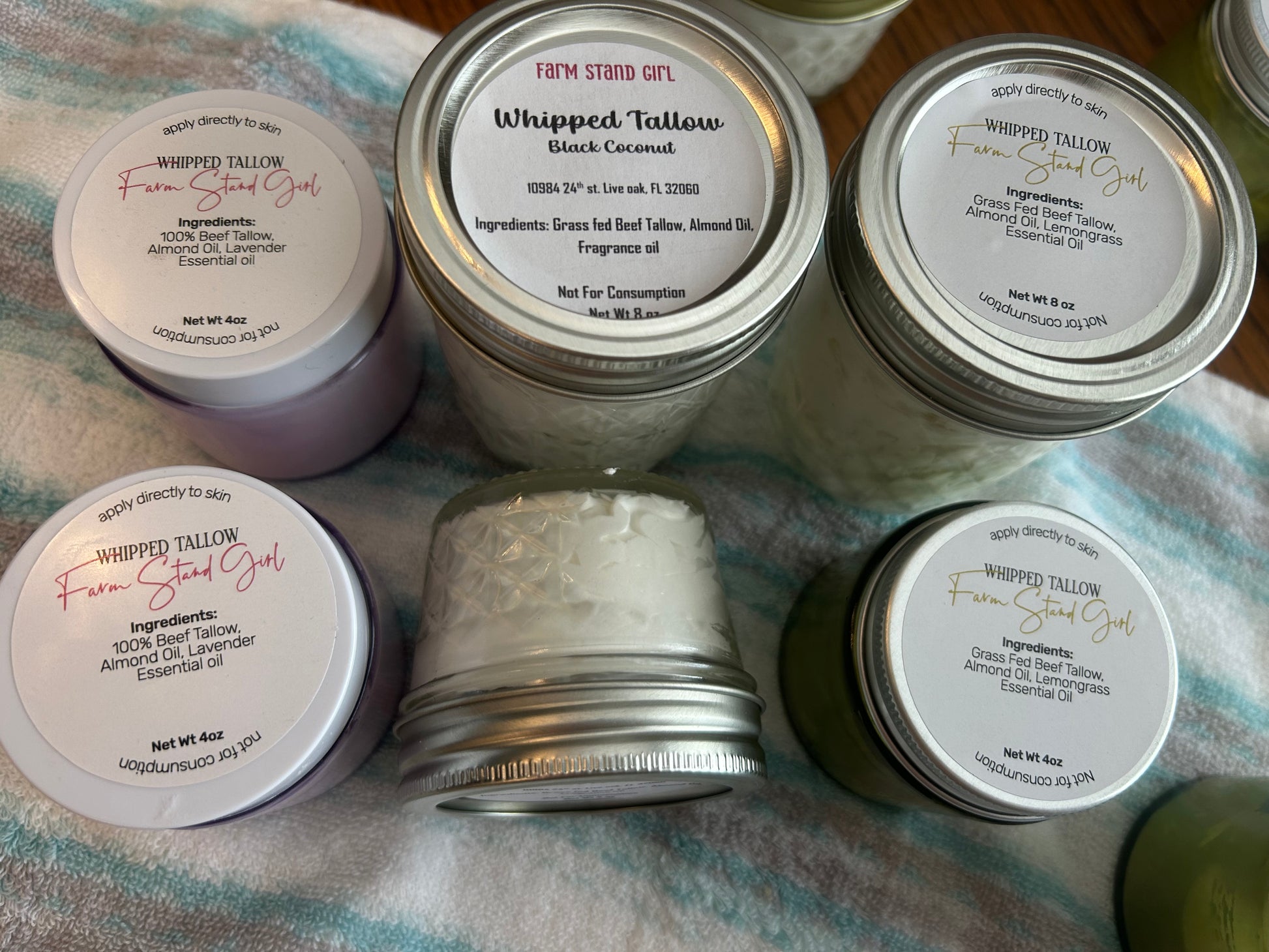 | The Whipped Tallow Cream with Black Coconut Fragrance Oils by Farm Stand Girl is a luxurious moisturizer perfect for all skin types. Made with grass-fed beef tallow, and almond oil, this cream is formulated for daily use on the head, lips, face, full body, hands, arms, feet, and legs. With a light and creamy texture, silky smooth, & non-beefy. this 8 fl oz cream is designed to leave your skin feeling hydrated and nourished. Enjoy the subtle scent of coconut while using this all-natural product from the Fame Stand Girl. It such a beautiful process! Whipped tallow has so many vitamins and nutrients! Beef tallow is rich in fatty acids like linoleic acid, which can help hydrate and soften the skin. Its composition is similar to human sebum (the skin's natural oils), allowing it to penetrate deeply and replenish the skin's moisture barrier! Which high amounts of Anti-inflammatory Properties:Conjugated linoleic acid (CLA), found in beef tallow, has anti-inflammatory properties that may help soothe redness, irritation, and conditions like eczema. The antioxidants in tallow, including vitamin E, can help fight free radicals, potentially reducing the appearance of fine lines and wrinkles! Age backwards and smell good doing so! We have whipped with lavender essential oils and lemongrass essential oils! |