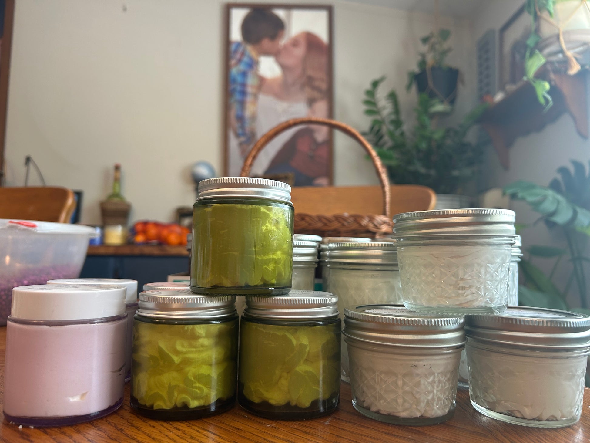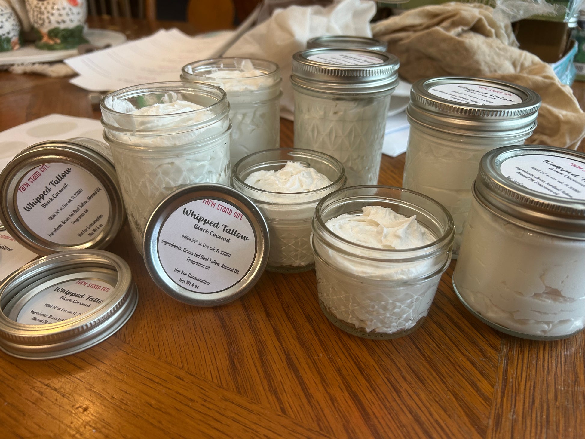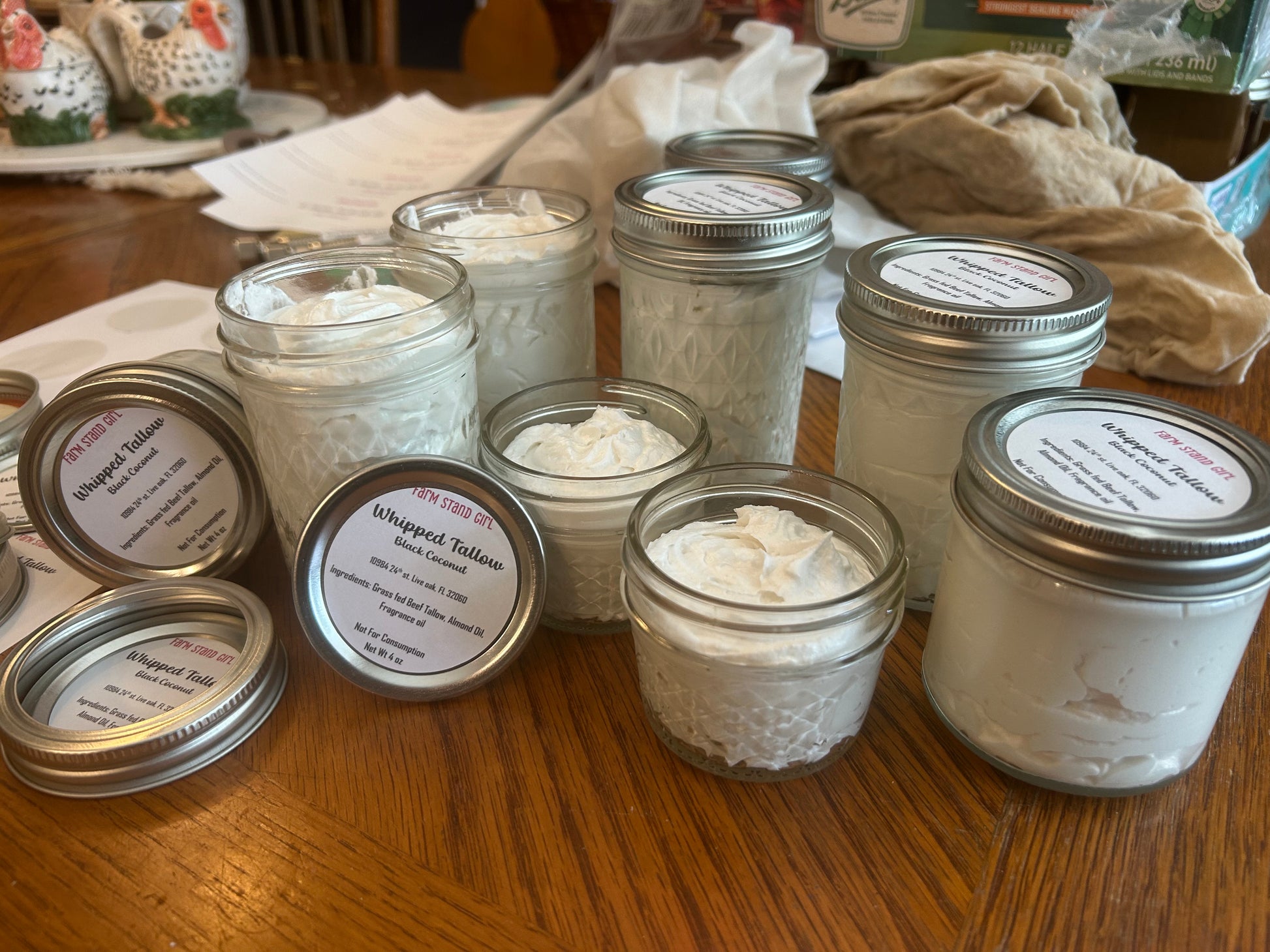 | The Whipped Tallow Cream with Black Coconut Fragrance Oils by Farm Stand Girl is a luxurious moisturizer perfect for all skin types. Made with grass-fed beef tallow, and almond oil, this cream is formulated for daily use on the head, lips, face, full body, hands, arms, feet, and legs. With a light and creamy texture, silky smooth, & non-beefy. this 8 fl oz cream is designed to leave your skin feeling hydrated and nourished. Enjoy the subtle scent of coconut while using this all-natural product from the Fame Stand Girl. It such a beautiful process! Whipped tallow has so many vitamins and nutrients! Beef tallow is rich in fatty acids like linoleic acid, which can help hydrate and soften the skin. Its composition is similar to human sebum (the skin's natural oils), allowing it to penetrate deeply and replenish the skin's moisture barrier! Which high amounts of Anti-inflammatory Properties:Conjugated linoleic acid (CLA), found in beef tallow, has anti-inflammatory properties that may help soothe redness, irritation, and conditions like eczema. The antioxidants in tallow, including vitamin E, can help fight free radicals, potentially reducing the appearance of fine lines and wrinkles! Age backwards and smell good doing so! We have whipped with lavender essential oils and lemongrass essential oils! |