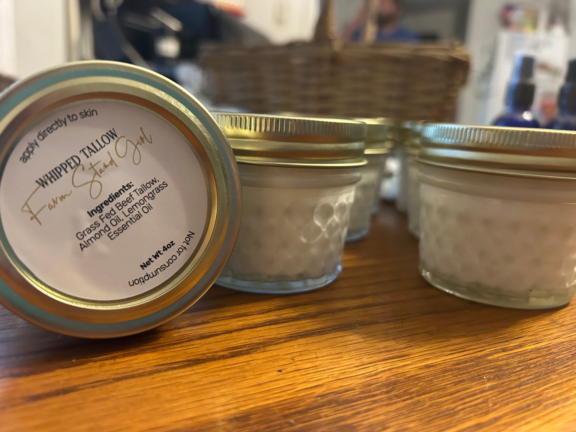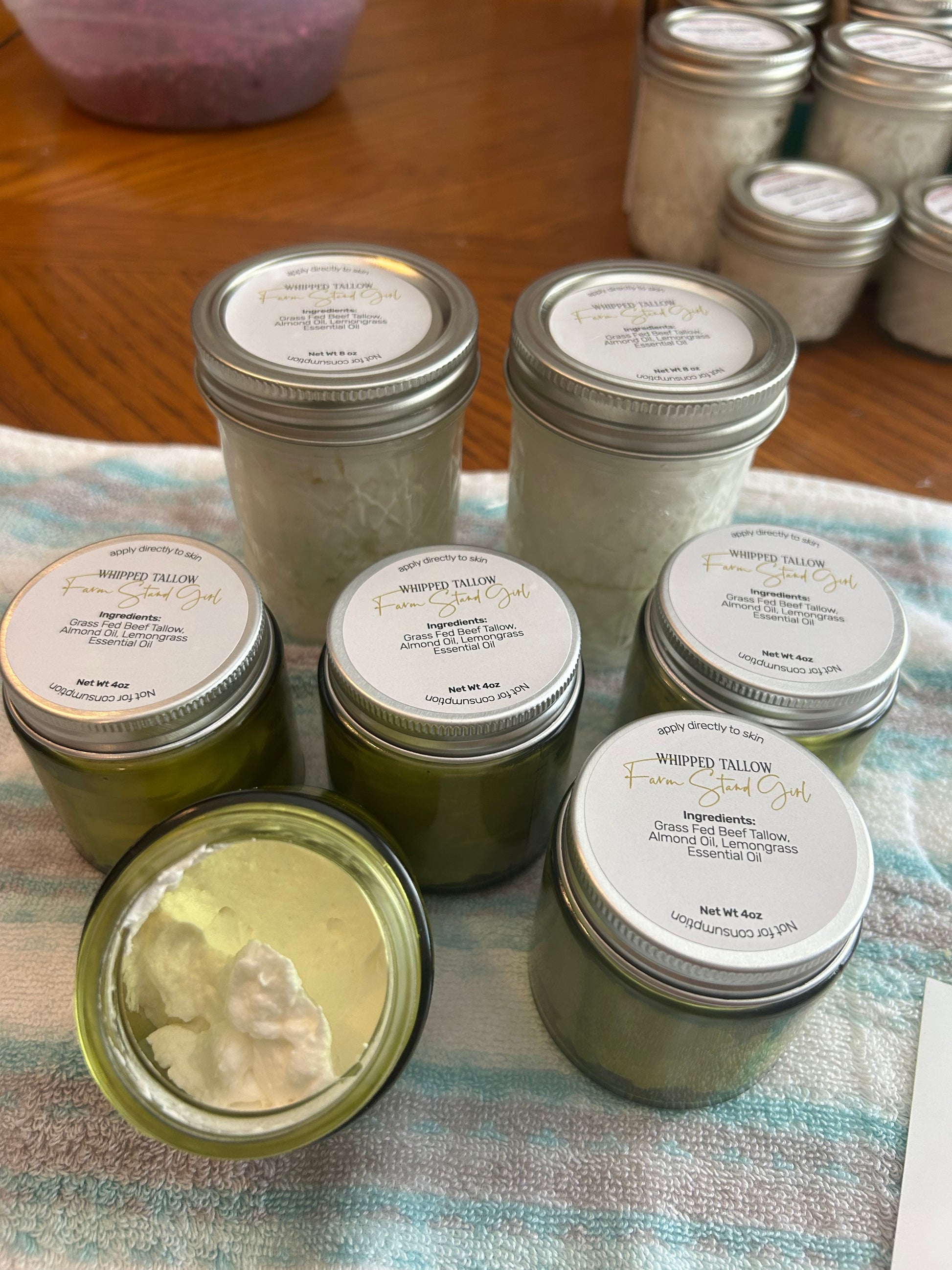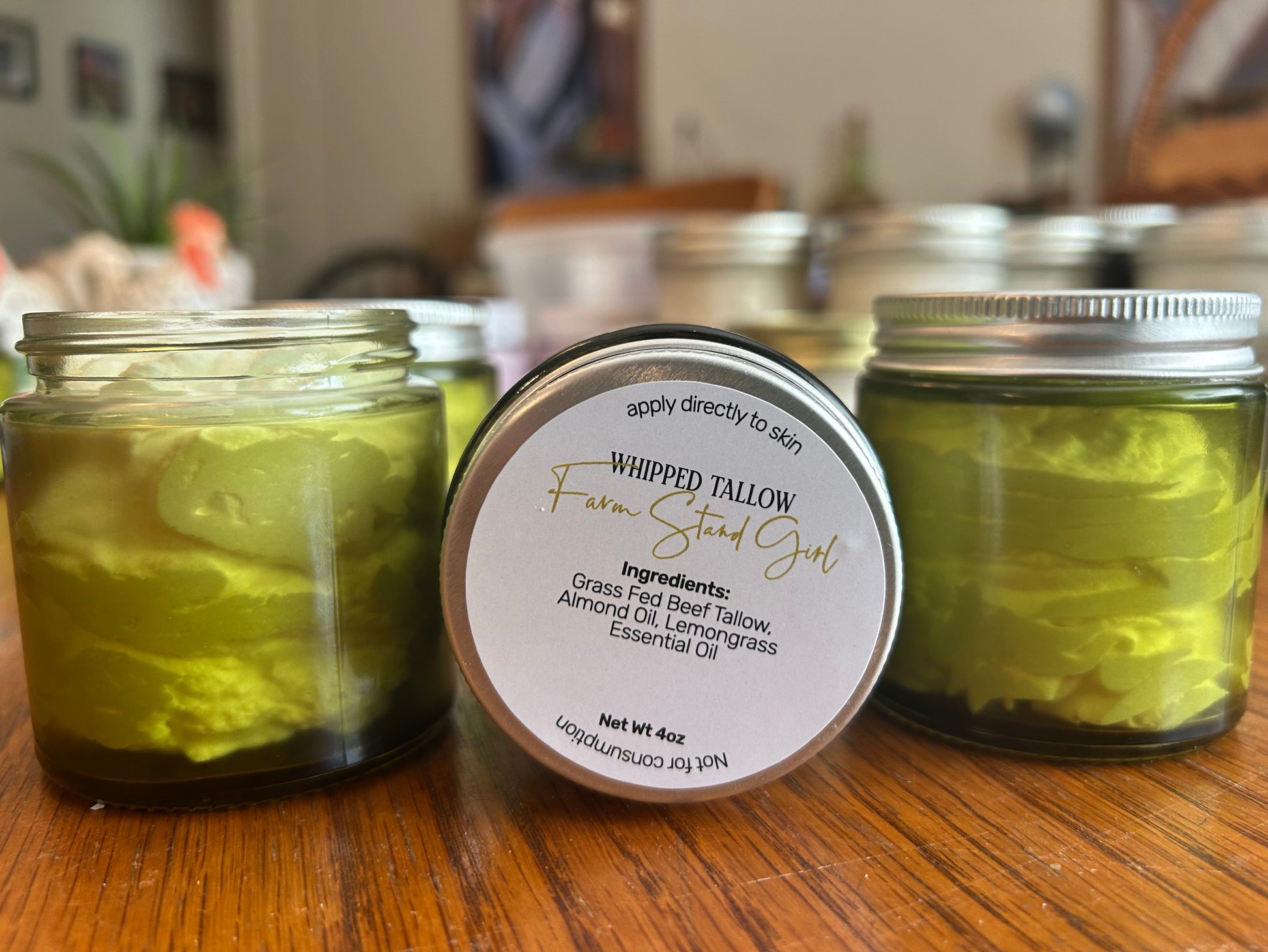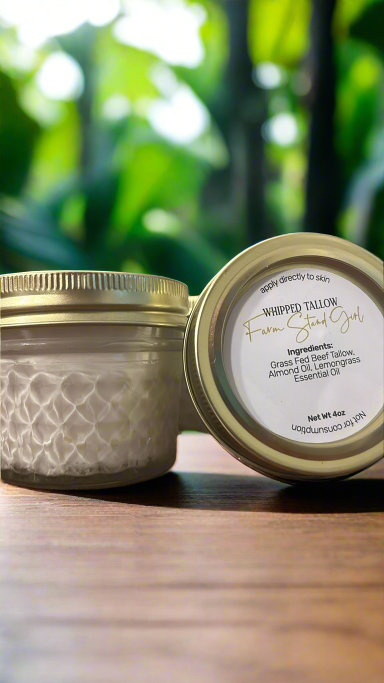 | The Whipped Tallow Cream with Lemongrass Essential Oils by Farm Stand Girl is a luxurious moisturizer perfect for all skin types. Made with grass-fed beef tallow, lemongrass essential oil, and almond oil, this cream is formulated for daily use on the head, lips, face, full body, hands, arms, feet, and legs. With a light and creamy texture, silky smooth, & non-beefy. this 4 fl oz cream is designed to leave your skin feeling hydrated and nourished. Enjoy the subtle scent of lemongrass while using this all-natural product from the Fame Stand Girl. It such a beautiful process! Whipped tallow has so many vitamins and nutrients! Beef tallow is rich in fatty acids like linoleic acid, which can help hydrate and soften the skin. Its composition is similar to human sebum (the skin's natural oils), allowing it to penetrate deeply and replenish the skin's moisture barrier! Which high amounts of Anti-inflammatory Properties:Conjugated linoleic acid (CLA), found in beef tallow, has anti-inflammatory properties that may help soothe redness, irritation, and conditions like eczema. The antioxidants in tallow, including vitamin E, can help fight free radicals, potentially reducing the appearance of fine lines and wrinkles! Age backwards and smell good doing so! We have whipped with lavender essential oils and lemongrass essential oils! |